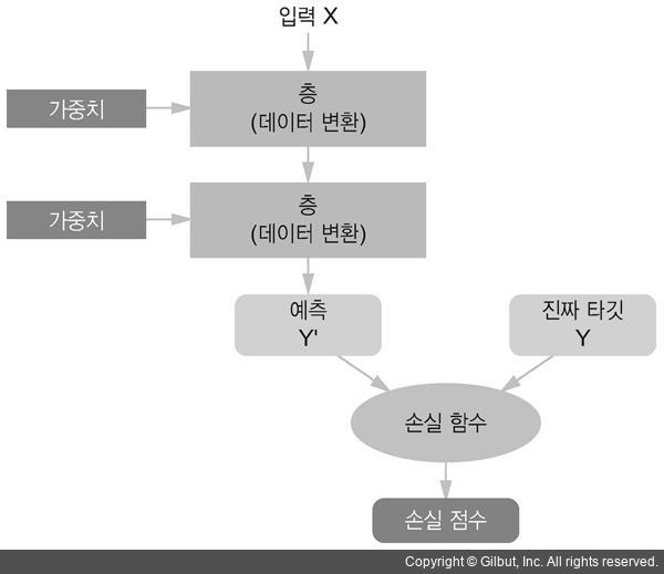 층에서 입력 데이터가 처리되는 상세 내용은 일련의 숫자로 이루어진 층의 가중치(Weight)에 저장되어 있다. 기술적으로 말하면 어떤 층에서 일어나는 변환은 그 층의 가중치를 파라미터(Parameter)로 가지는 함수로 표현된다. 맥락적으로 봤을 때, 학습은 주어진 입력을 정확한 타깃에 매핑하기 위해 신경망의 모든 층에 있는 가중치 값을 찾는 것을 의미한다. 하지만 어떤 심층 신경망은 수천만 개의 파라미터를 가지기도 한다. 이런 경우에 모든 파라미터의 정확한 값을 찾기는 어려울 것이다. 파라미터 하나의 값을 바꾸면 다른 모든 파라미터에 영향을 끼치기 때문이다.