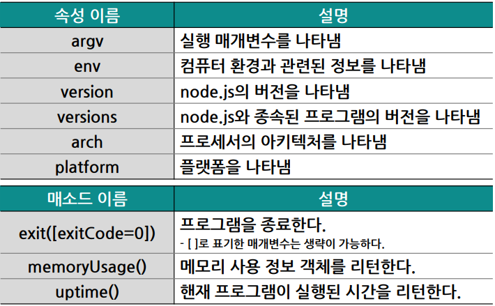 프로그램과 관련된 정보를 나타내는 객체다. 자바 스크립트에는 존재하지 않고 node.js 만이 가진 객체다.